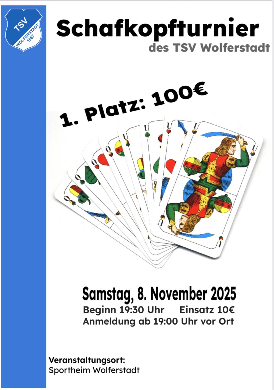Der TSV Wolferstadt veranstaltet im Sportheim am Samstag, den 08.11.2025 sein traditionelles Schafkopfturnier.