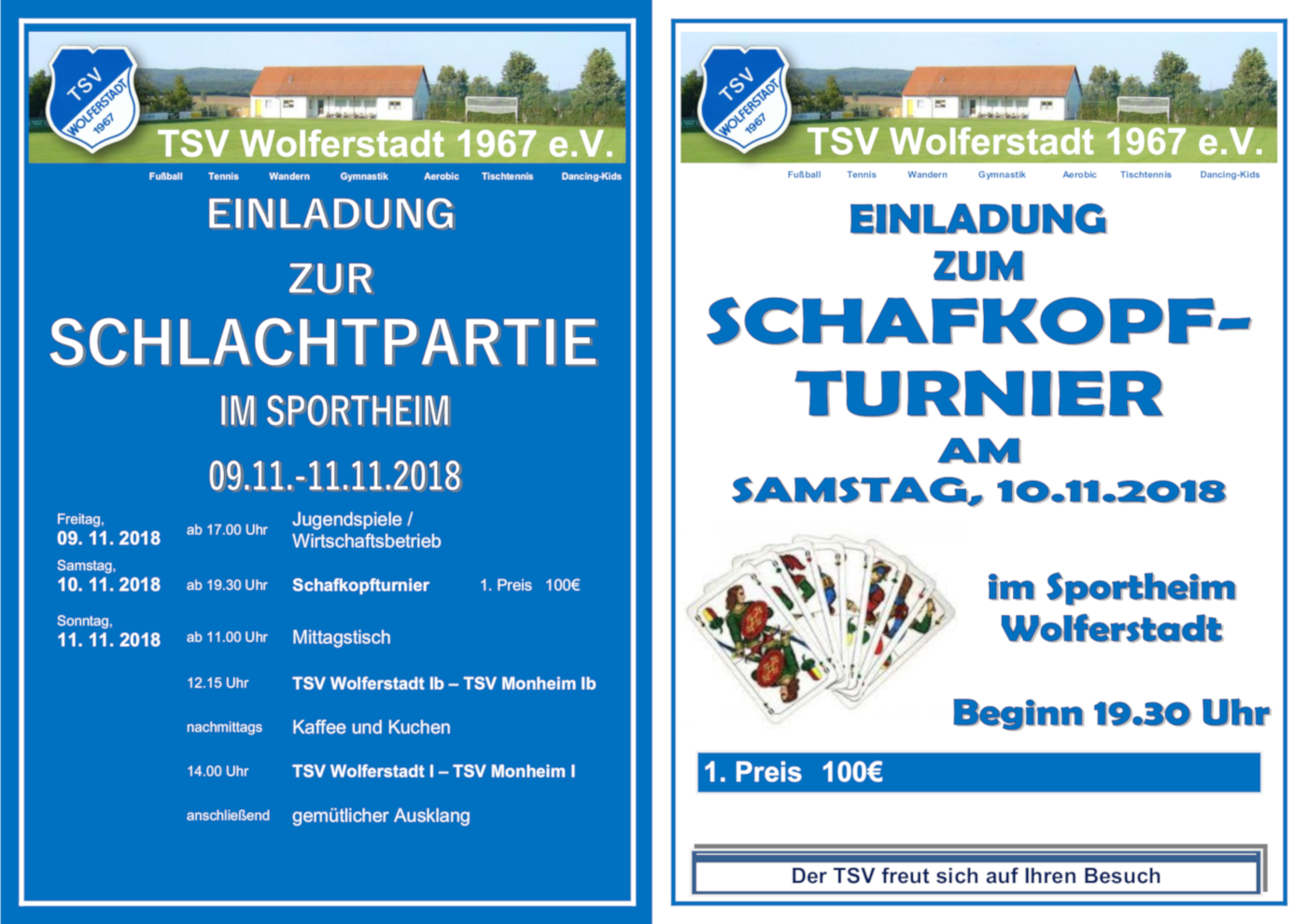 09.11. bis 11.11.2018 findet im Sportheim wieder die traditionelle Schlachtpartie statt.